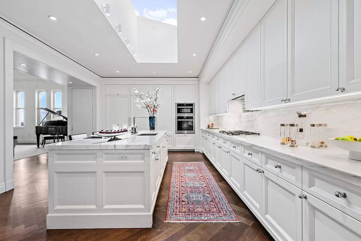 A custom-designed dream kitchen done in pale blue, marble and oak occupies over 1,000 square feet. Luxurious features include Calacatta Gold marble countertops and backsplash, oak cabinetry, a Gaggenau appliance package with dual refrigerators and dual freezers, dual convection ovens, a 60-inch cooking range with eight burners and a griddle and a 36-inch induction cooktop, plus two dishwashers.