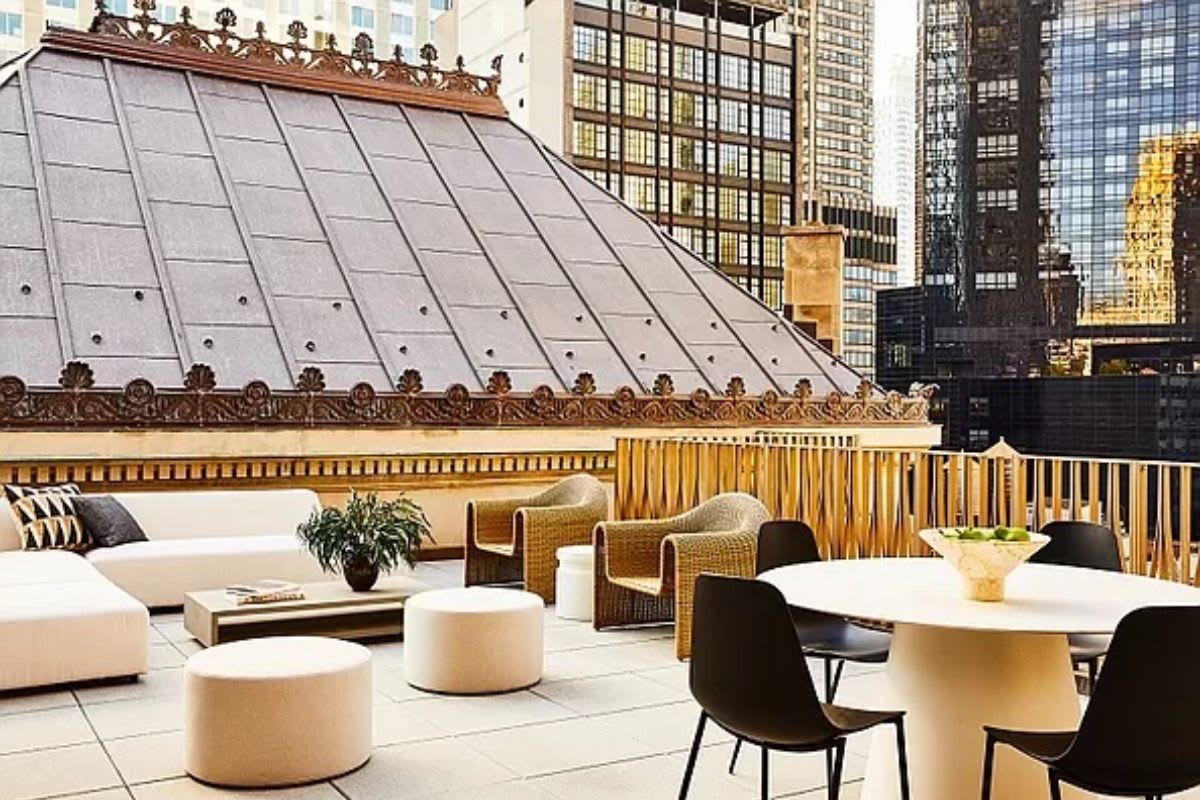 Upstairs, the impressive primary suite offers a spacious dressing room, and a spa-like bathroom, featuring a double vanity finished in white onyx, custom bronze hardware by P.E. Guerin, and a copper soaking tub handcrafted by William Holland. A private terrace of over 2,500 square feet surrounds the primary bedroom to the north, east and south, and offers an intimate view of Steinway Hall’s meticulously restored copper roof.