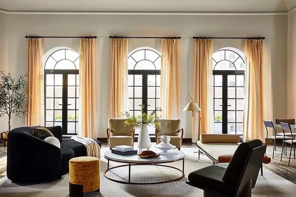 Claiming to be one of the city’s largest private residences, the converted condominium spans the building’s entire top two floors. Beneath ceilings as high as 22 feet, dramatic arched windows–some 20 feet tall–offer a kaleidescope of iconic views throughout the day and night. Walls are large enough to display museum-sized artworks.