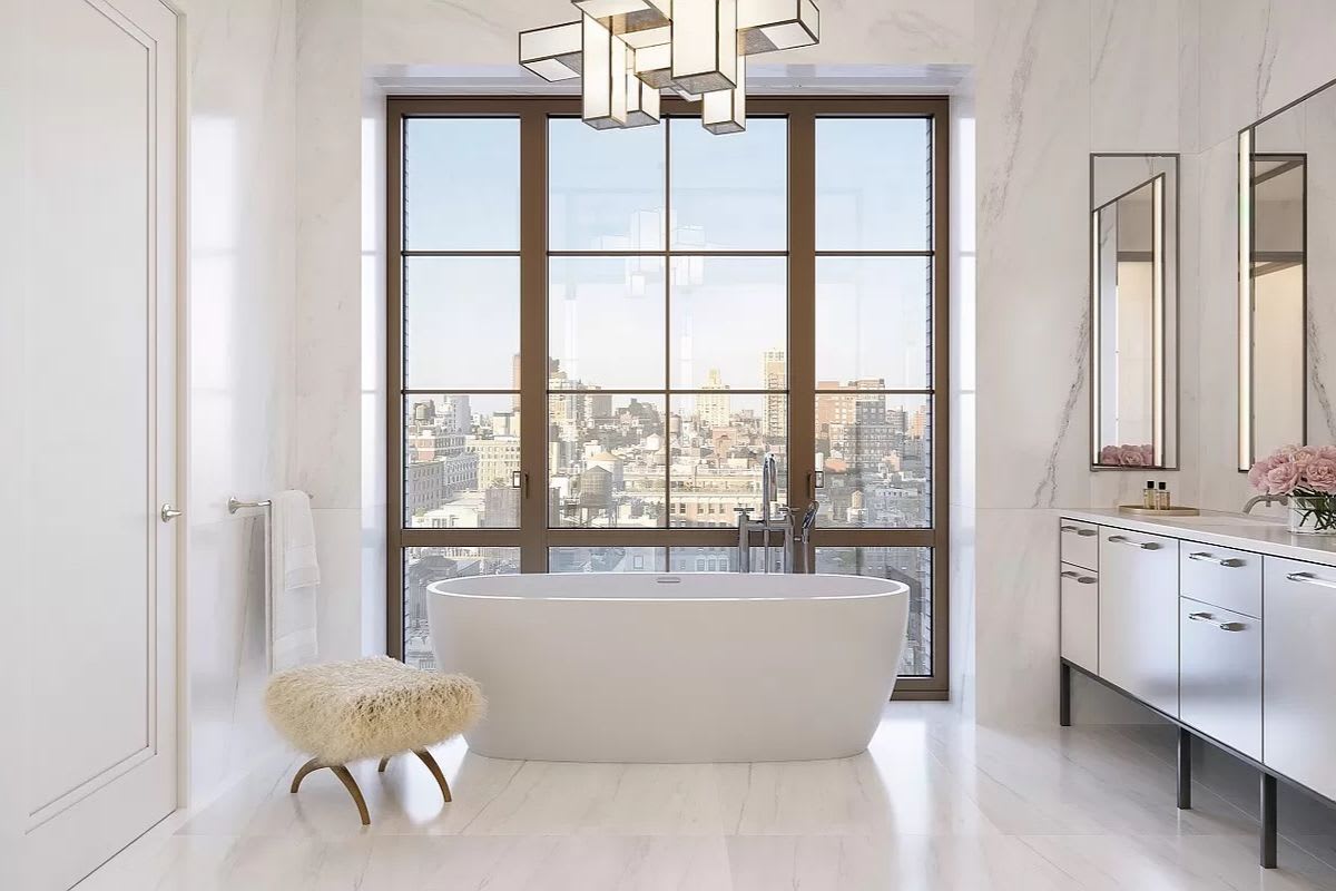 The bedroom wing offers tranquil and picturesque north and east views over gardens and landmarked townhouses below. The primary bedroom suite features three oversized walk-in closets, a windowed dressing room, a morning kitchen, and an east-facing wall of casement-style windows. The windowed primary bathroom is outfitted with honed Olympic Danby stone slab full-height walls and floors; a custom acid etched mirror vanity with an Olympic Danby stone slab countertop, nickel trim, and Lucite drawer pulls; recessed chrome-trimmed medicine cabinets featuring integrated lighting; and a Da Vinci freestanding soaking tub. Additional features include a separate nickel framed stall shower in fluted glass with a stone bench and a Duravit water closet.