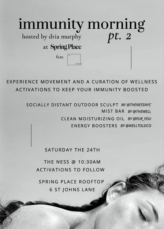 Take full advantage of fall rooftop season at Spring Place! Our fitness favorite the ness is hosting an Immunity Morning at the downtown hot spot featuring a socially distanced outdoor sculpt class followed by a handful of amazingly curated wellness activation from THE WELL, Well Told Health, ORA Space and FUR, and you so won’t want to miss it!
