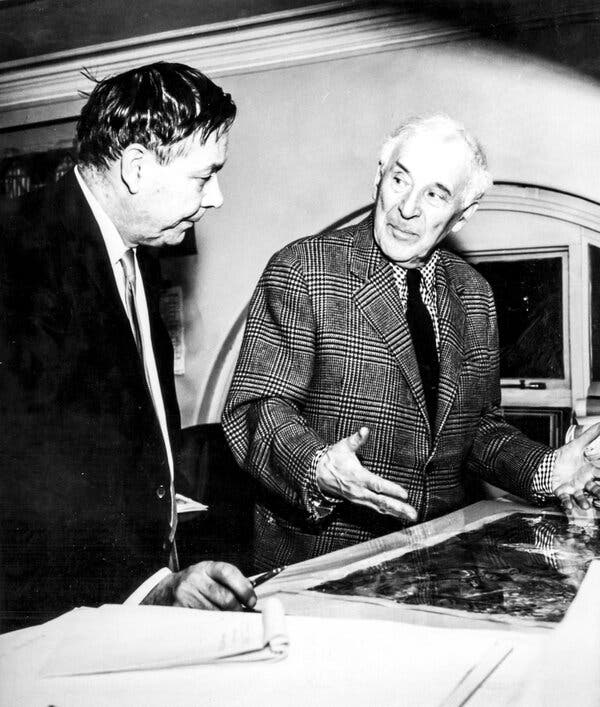 Chagall, right, with Vladimir Odinokov, his collaborator on the “Magic Flute” opera set, in 1967.Credit…Alamy, via Bonhams