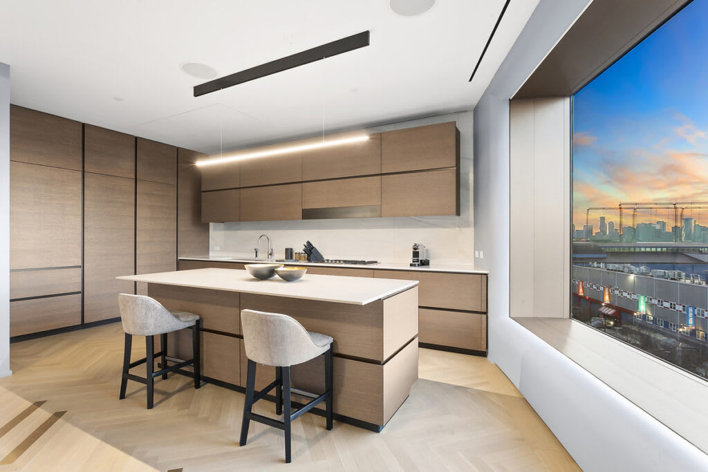 The voluminous great room with open living and dining affords a seamless flow for hosting guests, met by walls of windows and breathtaking panoramas. The chef is indulged with a premium-grade kitchen, brightened by an enormous picture window and appointed with all the finest – from natural oak cabinetry by Molteni to beveled Blanco de Macael marble countertops and island, to high-end appliances.